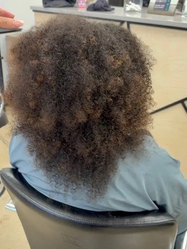 Curly hair restoration — from frizzy and undefined to beautifully defined, healthy curls with rich dimensional color.